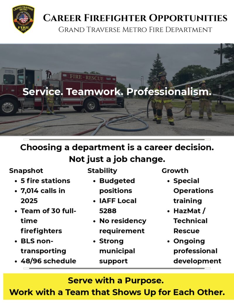 Application window closes Sunday. Grand Traverse Metro Fire Department is in the final days of accepting applications for three full-time Firefighter/EMT-B positions. These are budgeted positions as we continue to build and strengthen our team. At GTMESA, you’ll serve alongside a dedicated group of professionals in an IAFF union environment (Local 5288) while responding to over 7,000 calls annually, training for complex incidents, and supporting one another on every call. • 48/96 schedule | BLS non-transport • Special operations training opportunities • Pay: $57,529.56 – $71,836.35 (lateral consideration) • 96% employer-paid medical, dental, and vision (family included) If you’re ready for a career defined by service, teamwork, and professionalism, now is the time. Click the link below in the comments or visit our website