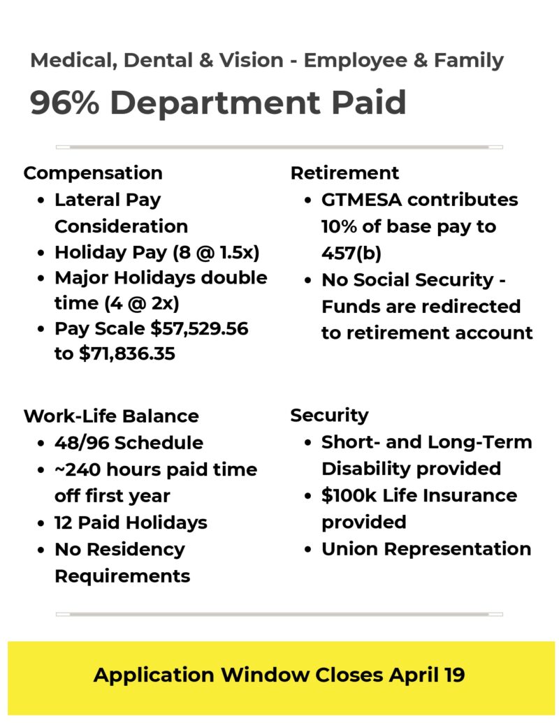 Time’s almost up. Applications for full-time firefighters with GTMESA close this Sunday. We’re adding 3 firefighters to a team built on service, professionalism, and trust. • IAFF Local 5288 • 48/96 schedule • 96% employer-paid benefits (family included) If you’ve been considering applying, use this as your sign.